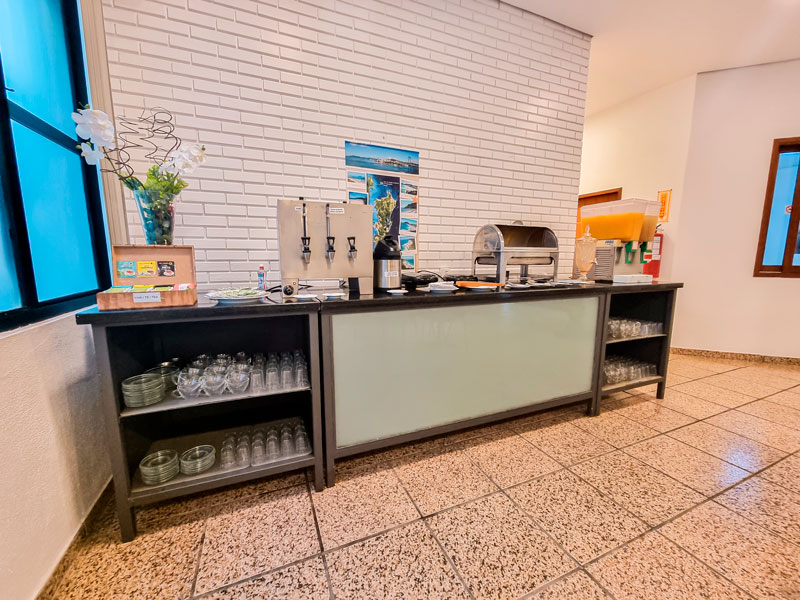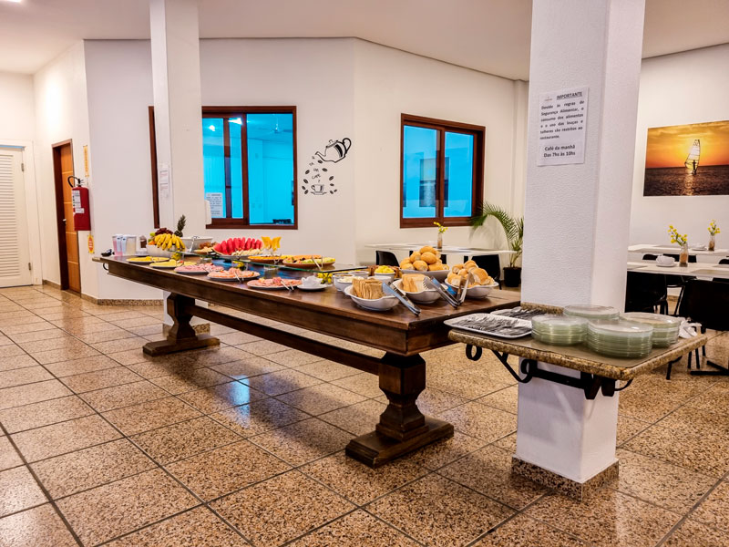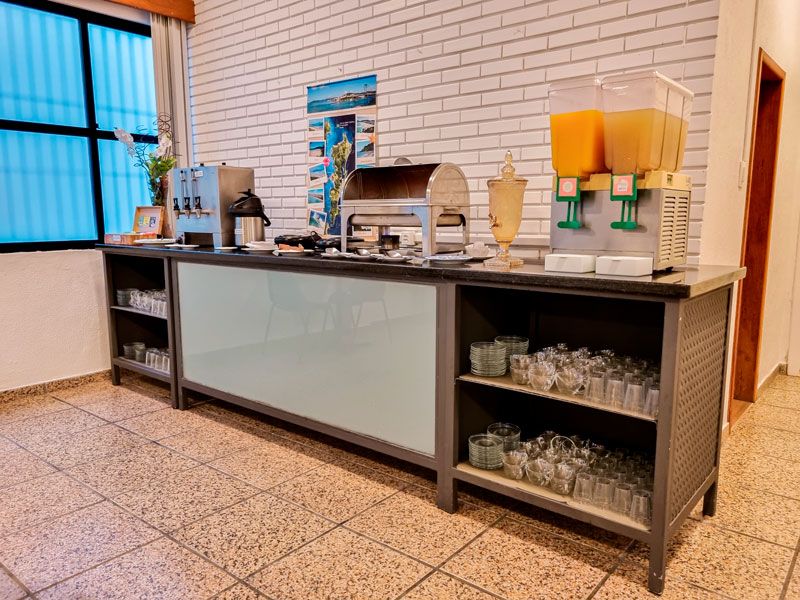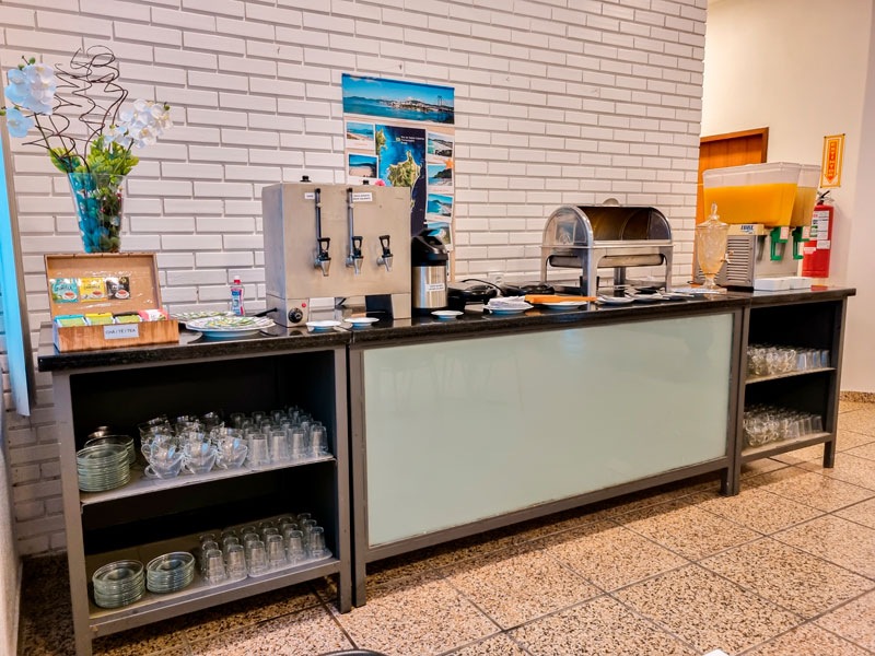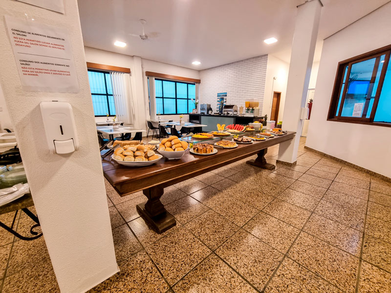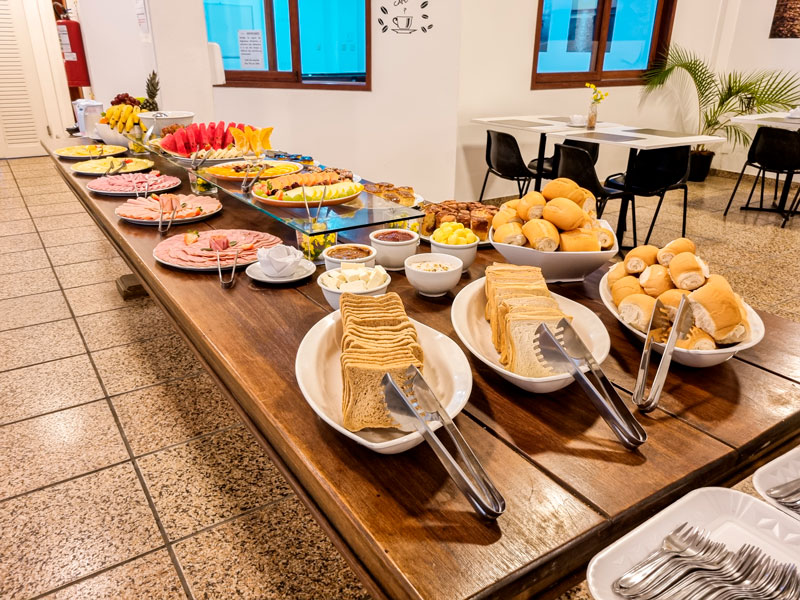 Além disso, o hotel também conta com opções quentes, como ovos mexidos, bacon, salsicha e linguiça, e também opções frias, como queijos e presuntos. Para acompanhar, há ainda café, leite, chás e outras bebidas quentes e frias.