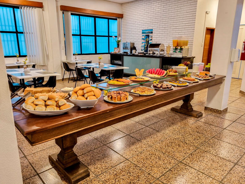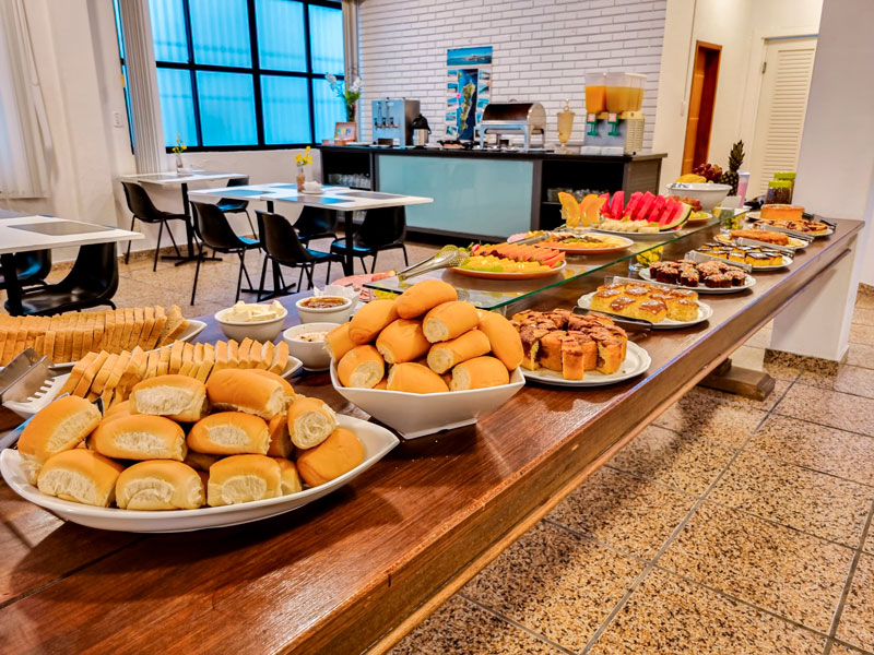 O buffet de café da manhã conta com diversas opções de pães, como pão de queijo, croissants, pães integrais, entre outros. Há ainda bolos, tortas, biscoitos e outras delícias para quem prefere algo mais doce.