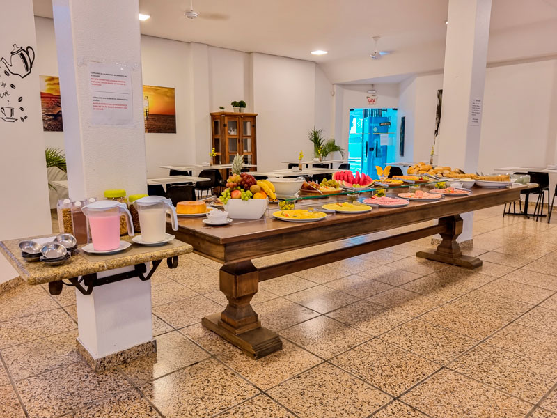 Para quem prefere um café da manhã mais saudável, o Canasgold Praia Hotel também oferece uma grande variedade de frutas frescas, como melão, mamão, abacaxi, uva e morango, além de sucos naturais e iogurtes.